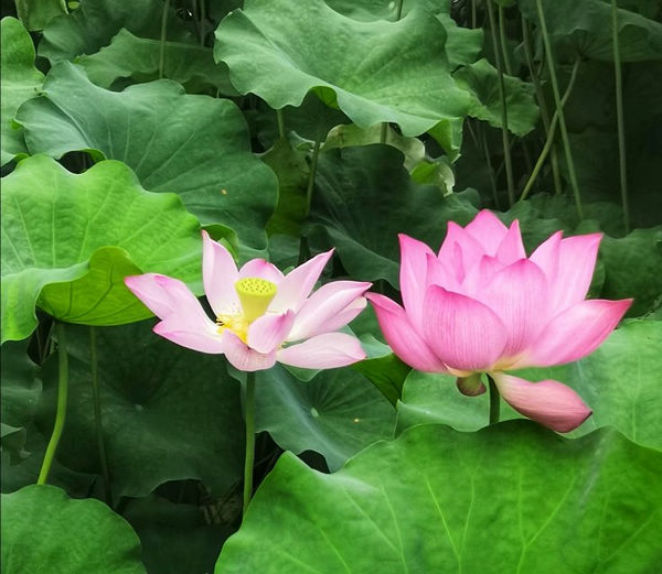 來到荷塘邊扶欄而望,滿眼的碧綠荷葉層層疊疊,猶如一把把圓傘撐開在水面上,荷葉上晶瑩的水珠,仿佛是落在綠色盤子里的珍珠,盡顯它獨(dú)特的靈氣。再看看那被一根根綠色梗子撐著的荷花,高高立在水面上,有的綠中帶紅,含苞待放;有的只開兩三片花瓣,略顯嬌羞;而那全開的荷花,露出嫩黃色的花蕊和小蓮蓬傲然地向我們展示著它們最美的面容,讓人賞心悅目,陶醉其中!微風(fēng)吹來,那碧綠舒開、裊裊婷婷的荷葉,亭亭玉立、纖塵不染的荷花,隨風(fēng)搖曳,婀娜多姿,寧靜而柔美,高潔而清雅,充滿詩情畫意……