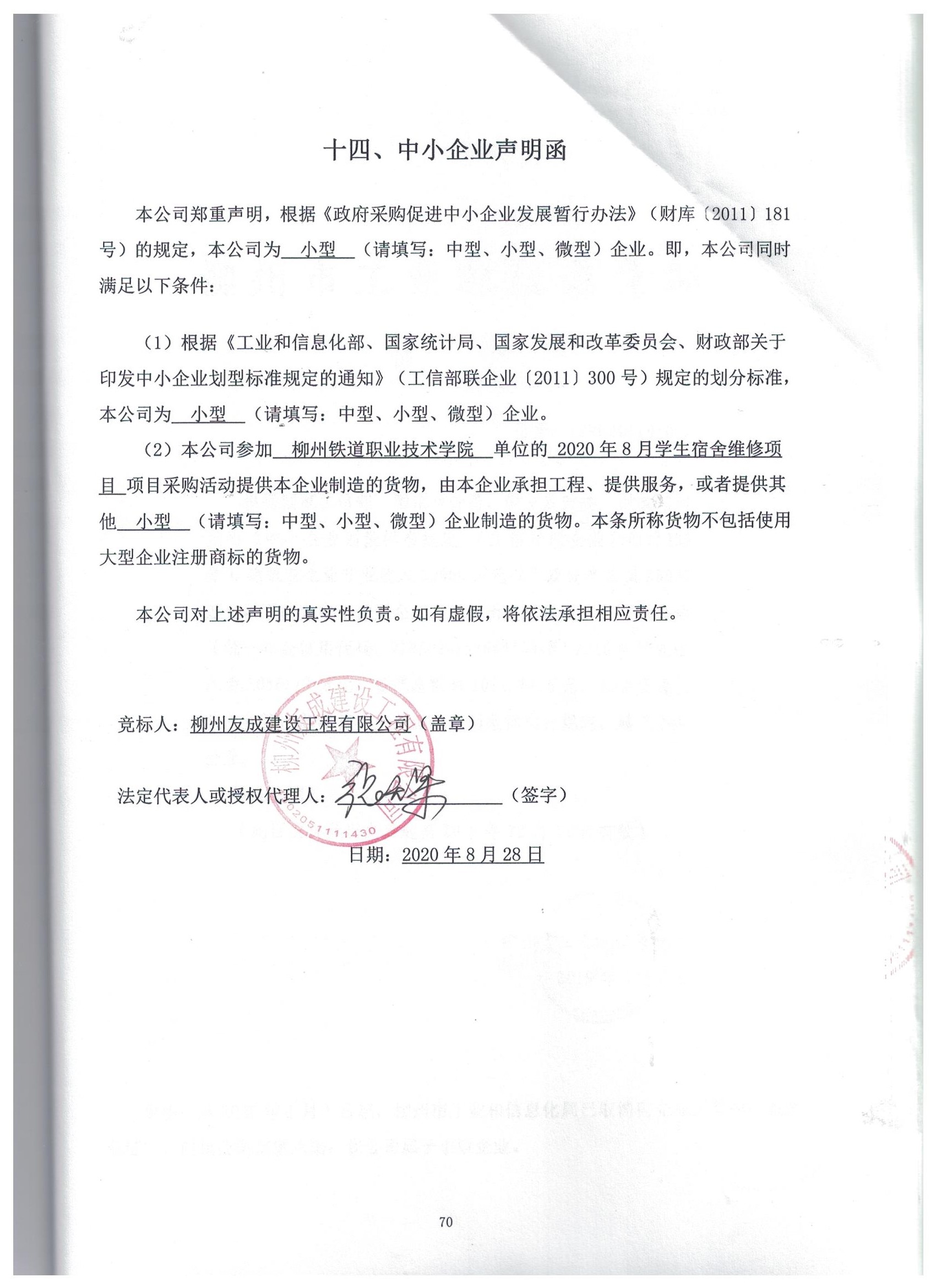 該成交供應(yīng)商聲明其為小型企業(yè),根據(jù)《關(guān)于印發(fā)〈政府采購促進中小企業(yè)發(fā)展暫行辦法〉的通知》(財庫〔2011〕181號)第五條的規(guī)定,對小型和微型企業(yè)服務(wù)的價格給予6%的扣除,用扣除后的價格參與評審。(附:成交供應(yīng)商《中小企業(yè)聲明函》掃描件